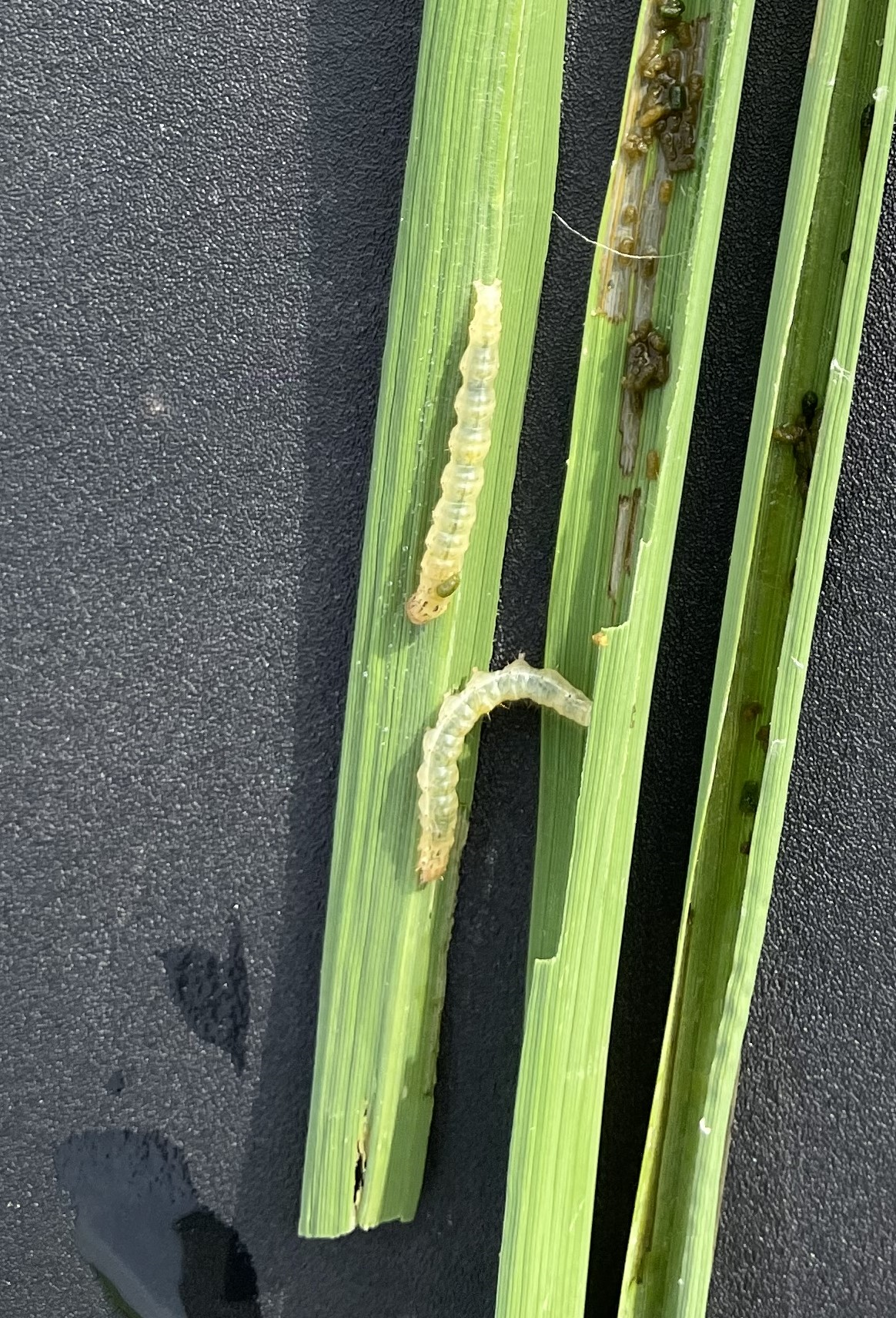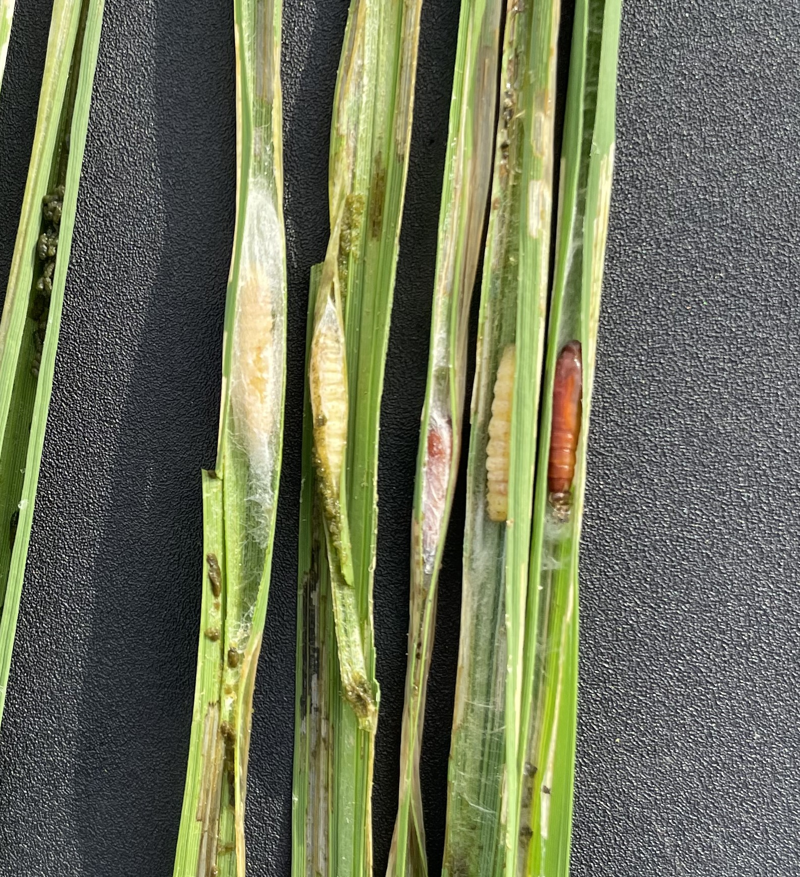 Sâu non nhả tơ cuốn dọc lá lúa thành một bao thẳng đứng hoặc bao tròn gập lại. Sâu nằm trong bao gặm ăn biểu bì mặt trên và diệp lục của lá theo dọc gân lá tạo thành những vệt trắng dài, các vệt này có thể nối liền nhau thành thành từng mảng làm giảm diện tích quang hợp và đặc biệt nếu hại trên lá đòng hoặc các lá cận lá đòng làm giảm năng suất rõ rệt.